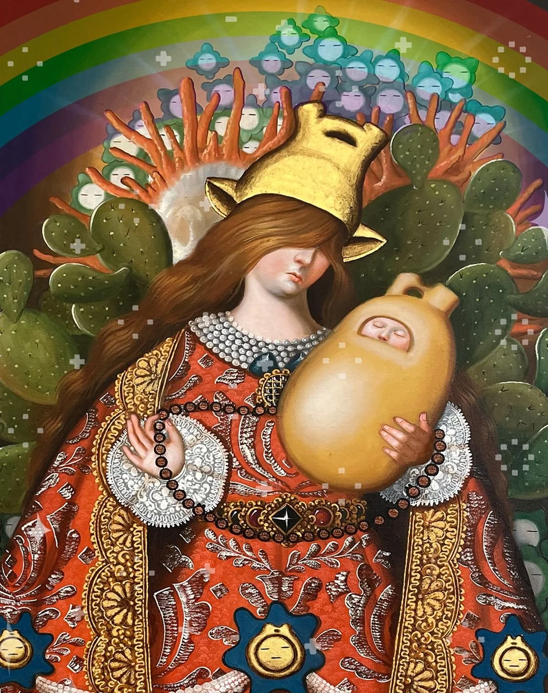 La Virgen Felina, o Virgen Montaña, por ejemplo es concebida como cuerpo-paisaje y matriz fértil, donde la vida emerge en constante metamorfosis. En este universo, la mujer no es únicamente madre, sino laboratorio y motor de evolución, un recipiente que condensa el salto de especies y la fuerza telúrica de la Pachamama.